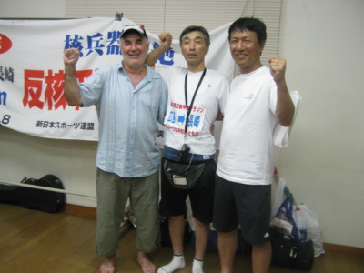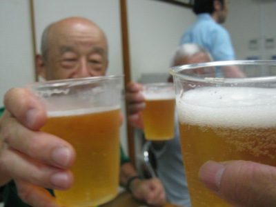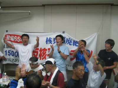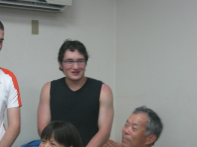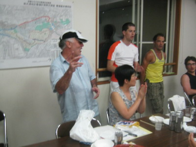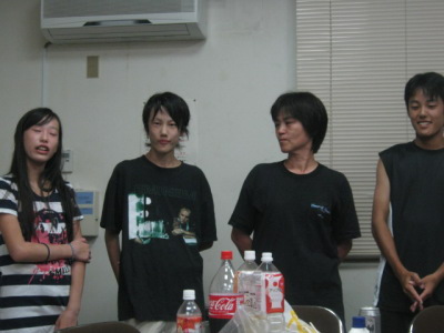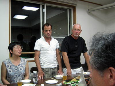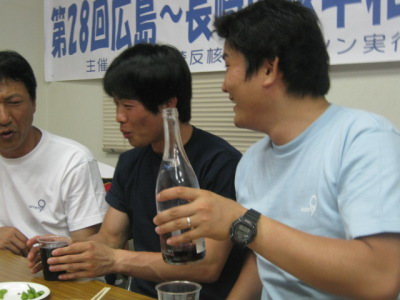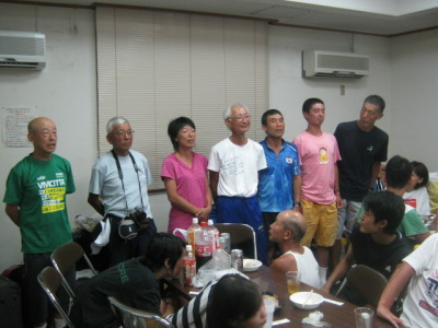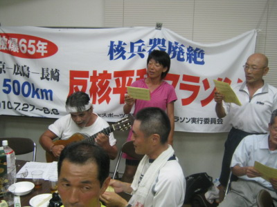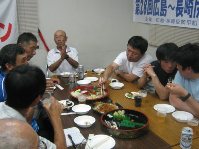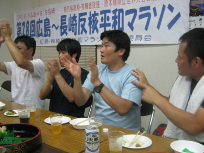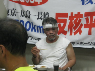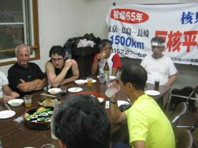 例年にない猛暑の中走り続ければ、疲れないはずはありません。精一杯頑張ってきたピースランナー達の労ををねぎらい、また走り切った喜びを共に分かち合うための交流会兼慰労会が20時過ぎから宿舎で行われました。そのほんのワンシーンをどうぞ。