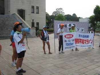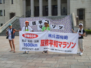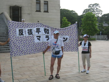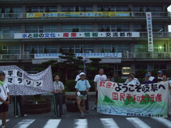 | 午後7時に岐阜県大垣市役所にゴール | 岐阜の新日本婦人の会のみなさんの手作り横断幕国民平和大行進も迎えられたんですね |