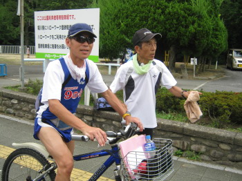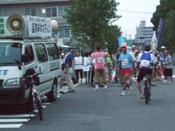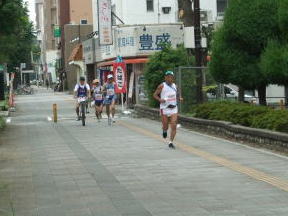 | 熱田神宮を横切って進みます | 前半はランナー、後半は自転車先導で大車輪の活躍だった小西只剛さん |