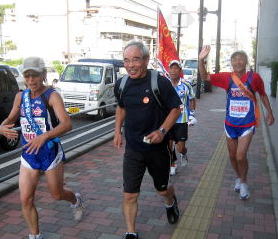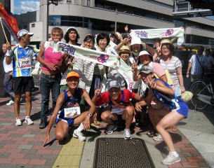 | おそろいのユニフォームで市内をアピール | 原水爆禁止世界大会に来た若者たちにも大歓迎されました。 | 途中一緒に走りだした方も… |