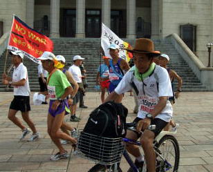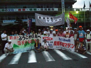 | 東京から5日間参加された亀卦川(きけがわ)さん。明るく良く通る声が明日から聞けないのはさびしい限りです | 大垣市役所では岐阜県連盟や、様々な団体のの熱烈な歓迎を受けました。同日に岐阜県内でも反核平和マラソンが行われました |