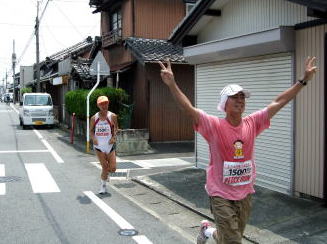 3日ぶりに朝日に迎えられてBブロックのスタートを切った5日目。今日は愛知県連盟からランナーと要員の方たちが大挙して駆けつけてくれました。また、前半を岡本清さん、後半を本宿から知立まで30キロ近く走った小西只剛さんが、それぞれ自転車でコース先導をしてくれました。
