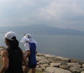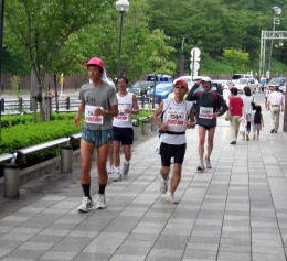 | 横浜から5日間参加された笹舘(ささだて)さん。いつも非常に素晴らしい走りでみんなをリードしてくださいました。 | なぎさ公園では琵琶湖を望みながら走ります。 | 終盤には京都のランナー達と合流して京都市役所前で本日のゴール |