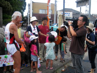 走り始めて1時間ほどの所で昨日に引き続き、川沢さんのご家族が総出で応援に駆けつけてくれました。そこにまたもや地元のテレビ局(Oniビジョン)の取材が入りいました。川沢さん本人やご家族がインタビューに応じ、早速その様子が放映されました。
