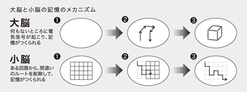 小脳は大脳とは全く反対で、最初におおざっぱにつながっているものが、ミスをしていくことでどんどん消えていきます。 例えば、迷路を想像してみてください。入口から入った電気信号は出口に向かって進みます。途中で間違った道だと気づいたら、そのルートが消えます。またもう1回ミスをしたら、それも消えていきます。そうして間違いを消していって、最後の残ったルートができたとき、それが記憶となります。