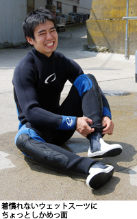 まず着なれないウェットスーツをつけるのにひと苦労、ホースで水を中に入れて「冷たーい!」と叫びながら、そのたびにズルッと着ていく。マスク、フィンをつけて、腰の深さの海でスキンダイビング(素潜り)の基本を学び、次に水深5mの場所へ移動して、水底へ向かって潜ってみる。3mほど潜れたので素潜りは成功、浮力が強いウェットスーツでこれだけ潜れたら言うことなし。ただ「耳抜き」がうまくできず、「耳が痛い」と言う。水圧で耳の鼓膜が押されるので、鼻の内側から空気を送って、内外の圧力差をなくすのが「耳抜き」だ。何度かトライして「右は抜けるけど、左がうまく抜けないときもある」とコツをちょっとつかんだところで午前の部は終了。
