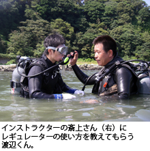 午後はタンクを背中につけて、ロープを頼りに水深5mへ潜行し、20分間のダイビングを楽しんだ。「最初は背中のタンクが揺れるのでバランスをとるのと、耳抜きに必死で、ほかの事は考えられなかった」そうだ。インストラクターの斎上さんによると、「中間あたりでは魚を見る余裕もでき、指差したりしていた」と言う。見た魚は、青くてきれいなソラスズメダイ、カワハギ、ネンブツダイなど、ほかにアオリイカの卵やコモンウミウシも見た。「後半は酔ったような感じだった。ボクシングで耳の下を打たれるとフラフラになるんだけど、こんな感じかな? スパーリングは痛いだけで、ダウンしないからフラフラになったことないけど。」