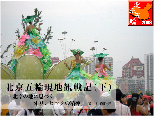 そして、アテネと変わらぬ7万人を越える若いボランティアの活躍と40万人を越える北京を訪れた外国人との交流は、北京オリンピックの最大の遺産となるのではないかと思いました。24日までの17日間はあっという間に過ぎ、帰国に際しては到着時の重い気分は一掃され、もう一度中国・北京を訪問し五輪後の変化を確かめたいという思いで満たされていました。