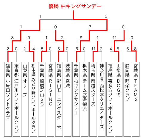 決勝は、小原田ソフトボールクラブ(福島)と柏キングサンデー(千葉)の対戦。柏のエース・平山投手が17奪三振と好投し、3−1で勝利した柏キングサンデーが3連覇を達成しました。最優秀選手賞は平山投手(柏キングサンデー)、優秀選手賞は根本選手(小原田)が選ばれました。