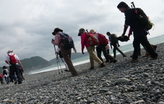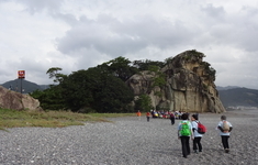 花の窟神社を出発し熊野灘をのぞみながら、七里御浜の砂利をしばらくふみしめると獅子岩にたどり着きました。自然の造形物を間近に見ることができ、悠久の年月を感じました。足元には台風の前触れの風に揺れているあざみがとても印象的で、山で育つあざみより背丈が低くたくましい感じです。