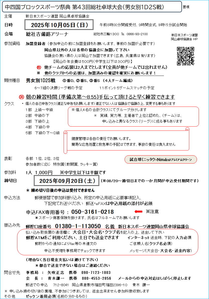 岡山 中四国ブロックスポーツ祭典 第43回総社卓球大会(男女別1D2S戦)