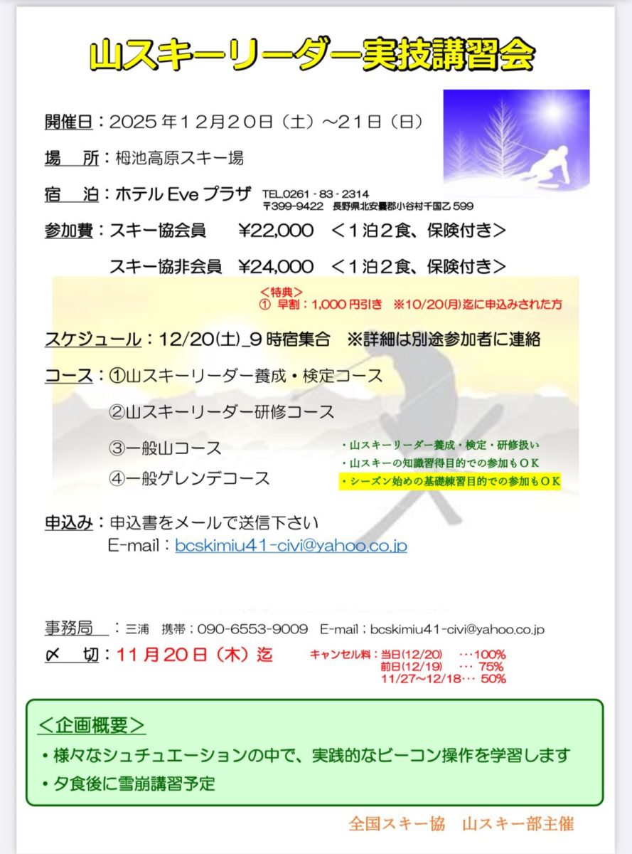 コース:①山スキーリーダー養成・検定コース②山スキーリーダー研修コース③一般山コース④一般ゲレンデコース