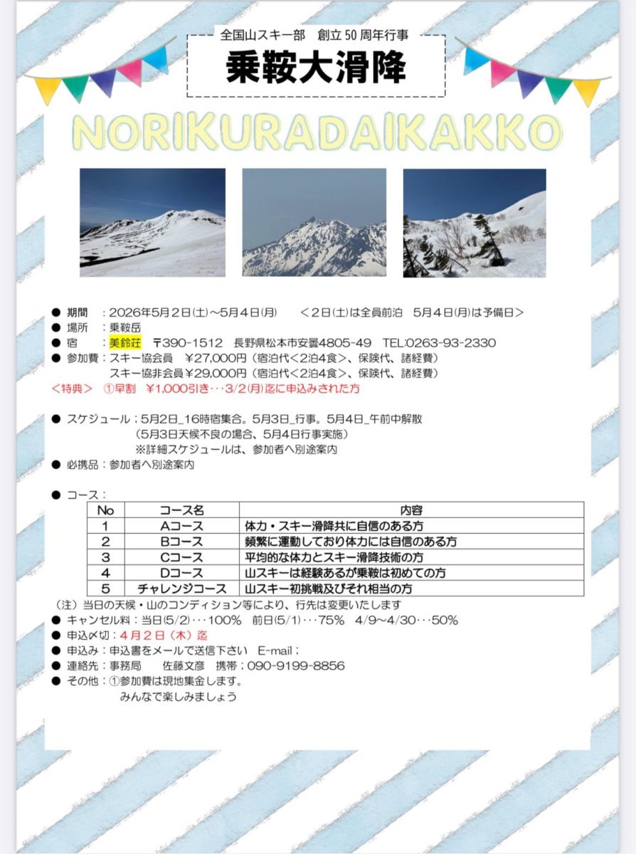 全国山スキー部 創立50周年行事 乗鞍大滑降