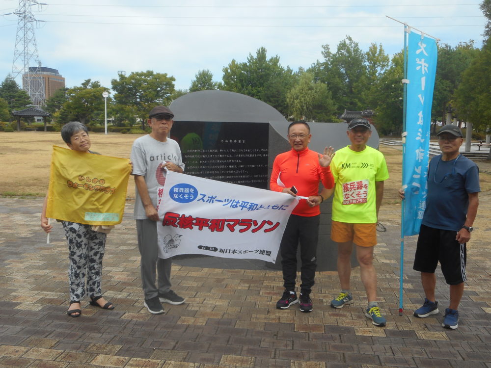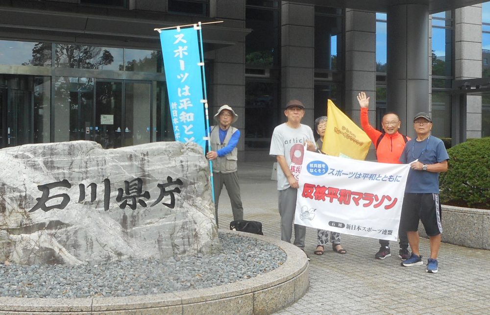 2025年8月9日、新スポ連石川県連盟は「ピース・ウォーク」を行い、6人が金沢市の姉妹都市公園をスタートし、石川県庁までの2kmをアピールしました。「戦後・被爆80年 平和を願うネットワーク」の呼びかけに応じたもの。そして、県庁19階展望ロビーに展示されたパネルを見たり、「平和のうたごえの集い」に参加し、皆さんと一緒に合唱して平和の思いを強くしました。