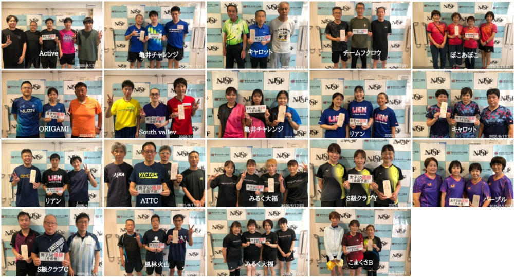 2025年8月17日、岐阜市もえぎの里多目的体育館・アリーナで「第6回 東海オープン岐阜県卓球年代別団体戦(男子・女子)兼 第61回 全国卓球選手権大会(年代別団体戦の部) 岐阜県予選会」が開催されました。結果は以下のホームページから。