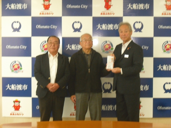 11月17日に、岩手県連盟の平井正理事長と岩手スキー協の佐藤静雄会長の2名で大船渡市役所を訪問し、全国の仲間の皆さんからの募金総額261,641円を大船渡市・渕上清市長に届けました。